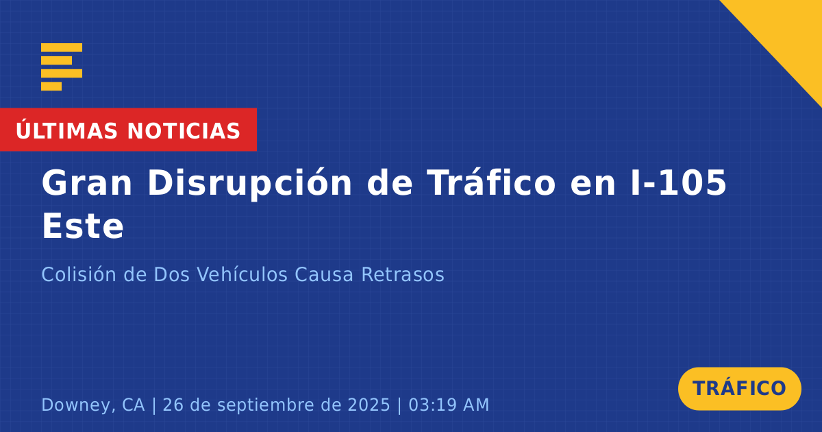 Una colisión de tráfico en la Interestatal 105 Este en la salida de Lakewood Boulevard en Downey, CA, ha causado importantes interrupciones en el tráfico hoy. El incidente, que involucró a dos vehículos—un Toyota 4Runner plateado y un SUV pequeño—ocurrió esta mañana alrededor de las 3:20 AM. Inicialmente, la salida fue cerrada, lo que resultó en restricciones de carriles y posibles retrasos para los conductores durante la hora pico de la mañana.