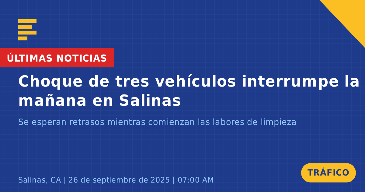 Un accidente de tráfico que involucró a tres vehículos ocurrió hoy en la intersección de la Ruta Estatal 68 y Torero Drive en Salinas, CA, lo que provocó importantes interrupciones en el tráfico durante la hora pico de la mañana. El incidente involucró a un Acura azul, un Toyota verde y un SUV negro. Uno de los vehículos chocó contra un poste de electricidad, que ahora descansa sobre el Acura, causando la caída de las líneas eléctricas.