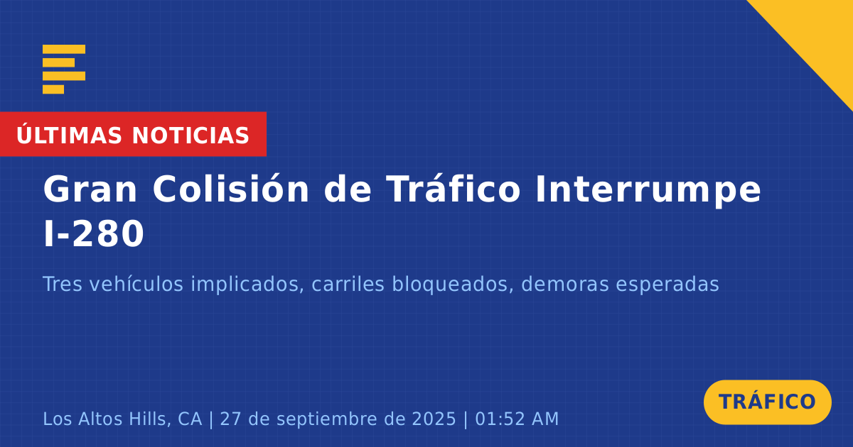 Un accidente de tráfico que involucró a tres vehículos ocurrió hoy en la Interestatal 280 Norte, cerca de la salida de El Monte Road en Los Altos Hills, CA. El incidente tuvo lugar durante las primeras horas de la mañana y estuvo involucrado un sedán gris, una furgoneta marrón y un vehículo desconocido. Esta colisión resultó en bloqueos significativos de carriles, con dos carriles obstruidos, lo que provocó retrasos y congestión para los conductores en la zona.