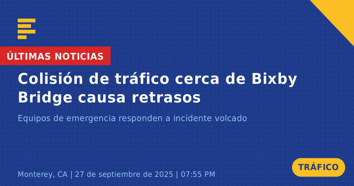 Una colisión de tráfico en la Ruta Estatal 1 cerca del Puente Bixby en Monterey, CA, ha causado interrupciones significativas en el tráfico hoy. El incidente ocurrió alrededor de las 7:55 PM, cuando un solo vehículo, una camioneta Ford Ranger blanca, fue reportado de lado, bloqueando al menos un carril en dirección norte.