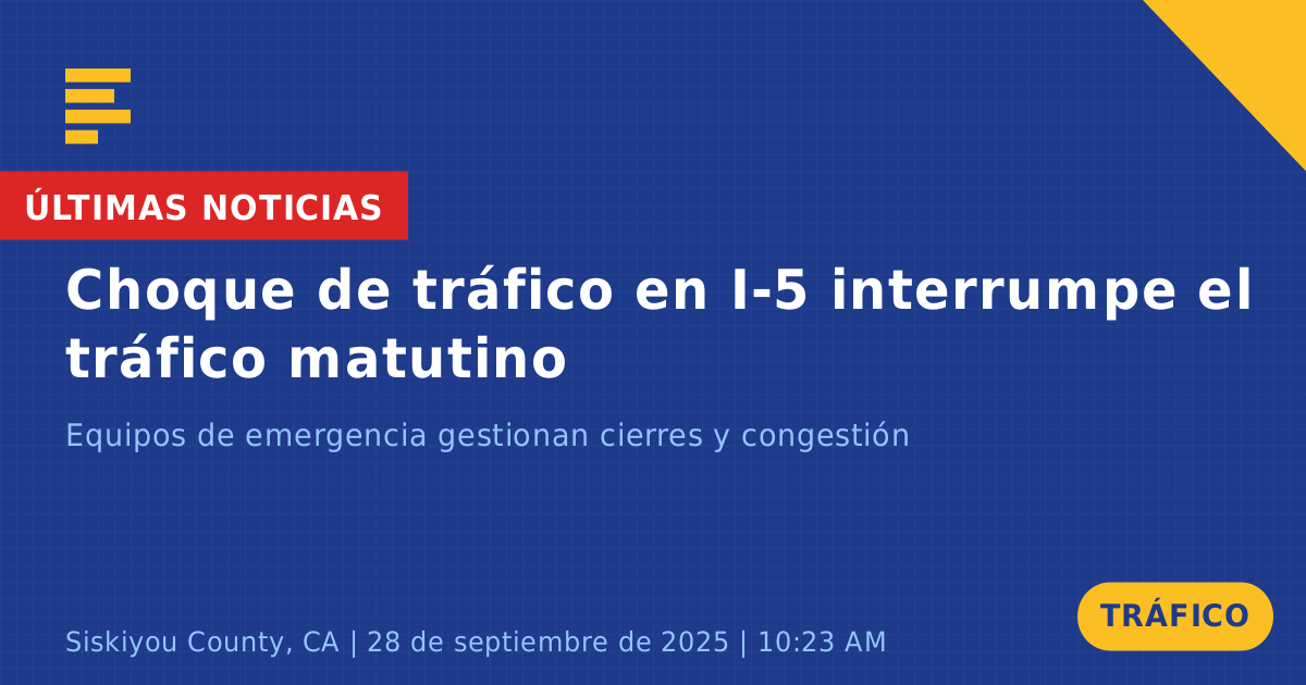 Un accidente de tráfico que involucró a dos vehículos, un Tesla y un camión de carga, ocurrió hoy en la Autopista 5 Sur (I-5 S) cerca de la Salida 751 en el Condado de Siskiyou, CA. El incidente fue reportado aproximadamente a las 10:26 AM, con los vehículos encontrados fuera de la carretera y en una colina.