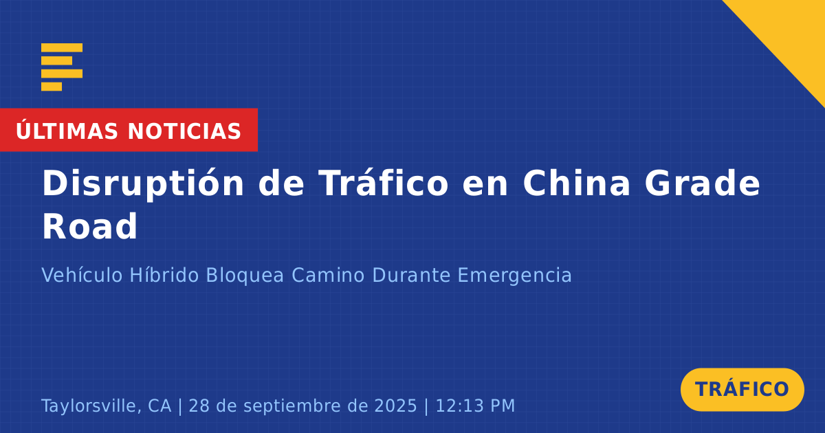 Un accidente de tráfico ocurrió hoy en China Grade Road cerca de Mount Hough Crystal Lake Road en Taylorsville, CA, lo que provocó importantes interrupciones en el tráfico. El incidente involucró un vehículo híbrido eléctrico que experimentó problemas eléctricos, lo que resultó en que el vehículo bloqueara la carretera.