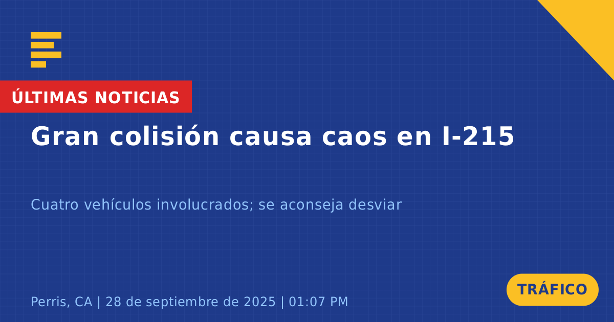 Un importante choque de tráfico en la Interestatal 215 Sur en Perris, CA, ha provocado grandes interrupciones en el tráfico hoy. El incidente ocurrió poco después de la 1 PM e involucró cinco vehículos, incluido un Nissan Titan blanco que volcó, una camioneta blanca que se dio vuelta, una furgoneta blanca que salió de la carretera antes de ser enderezada, y un Toyota blanco que terminó en una zanja cerca de la rampa de acceso.