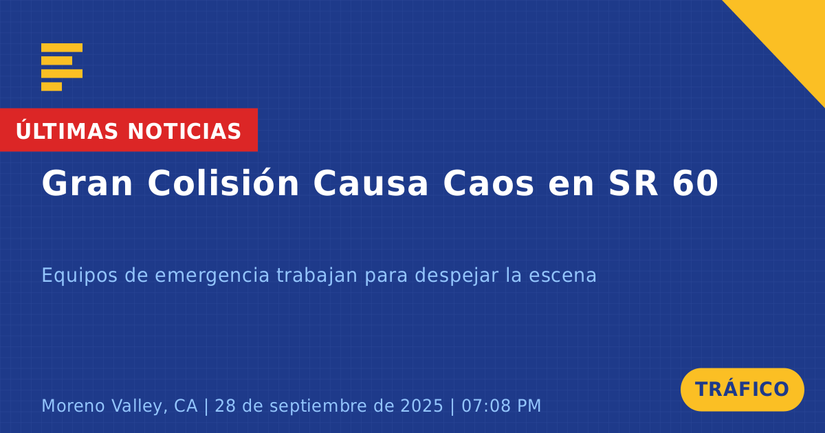 Un accidente de tráfico ocurrió hoy en la Ruta Estatal 60 Oeste, al este de Pigeon Pass Road en Moreno Valley, CA, involucrando tres vehículos: un Nissan Altima blanco, una Toyota Sienna gris y un SUV Mitsubishi blanco. El incidente fue reportado aproximadamente a las 7:08 PM, lo que llevó a cierres inmediatos de carriles mientras los equipos de emergencia llegaban al lugar.