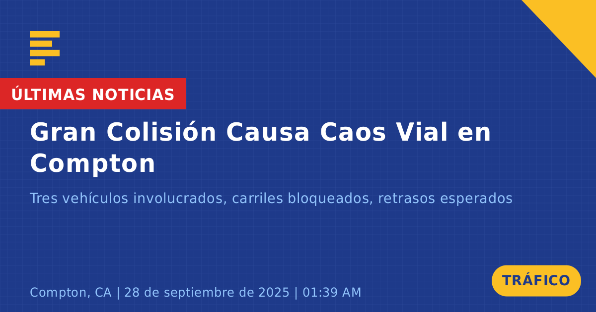 Un importante accidente de tráfico ocurrió hoy en la Ruta Estatal 91 Este cerca de la Avenida Central Sur en Compton, CA, lo que provocó grandes interrupciones en el tráfico. El incidente involucró a tres vehículos: una camioneta grande de color azul, un Honda plateado y un BMW plateado o un SUV gris. La colisión bloqueó los carriles izquierdo y medio, causando una congestión significativa en la zona.