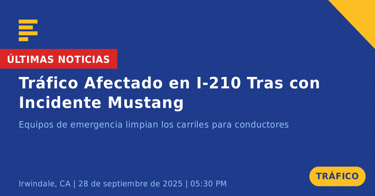 Una colisión de tráfico en los carriles este de la Interestatal 210 (I-210) cerca de la Avenida Irwindale en Irwindale, CA, causó importantes interrupciones en el tráfico hoy. El incidente involucró un vehículo, un Ford Mustang, y ocurrió alrededor de las 5:29 PM. Los servicios de emergencia, incluyendo la Patrulla de Caminos de California (CHP), el Departamento de Bomberos del Condado de Los Ángeles (LACOFD) y el Patrullaje de Servicio de Autopistas (FSP), respondieron rápidamente a la escena para gestionar el tráfico y controlar la situación.