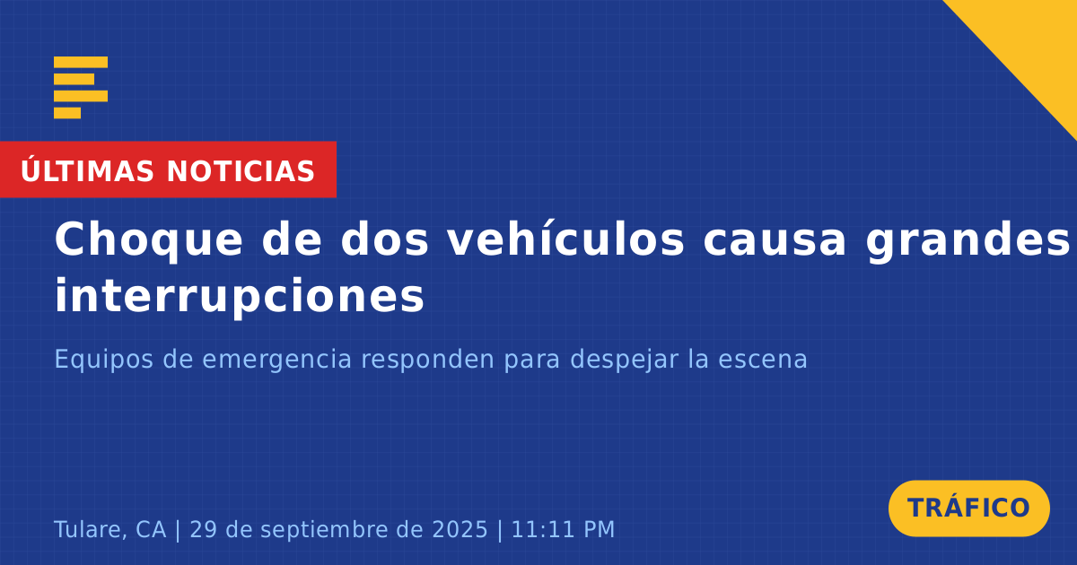 Un choque de tráfico que involucró a dos vehículos ocurrió hoy en la Ruta Estatal 99 Sur cerca de la salida de Prosperity Avenue en Tulare, CA. El incidente tuvo lugar alrededor de las 11:13 PM e involucró a una furgoneta blanca y un Ford Mustang.