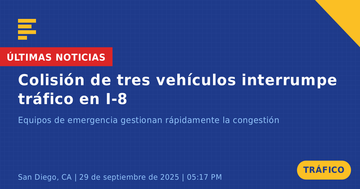 Un accidente de tráfico que involucró a tres vehículos ocurrió hoy en la Interestatal 8 Este (I-8 E) en el intercambio con la Interestatal 805 Este (I-805 E) en San Diego, CA. El incidente tuvo lugar alrededor de las 5:19 PM e involucró a un Honda gris, un Toyota blanco y un Jeep.