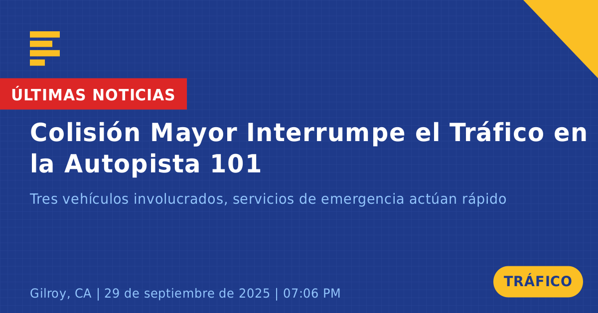 Un accidente de tráfico ocurrió hoy en la Autopista 101 Sur de EE. UU. en la Ruta Estatal 25 en Gilroy, CA, causando importantes interrupciones durante la hora pico de la tarde. El incidente involucró tres vehículos: un sedán plateado, un sedán gris que fue encontrado de lado y otro vehículo que supuestamente se elevó en el aire.