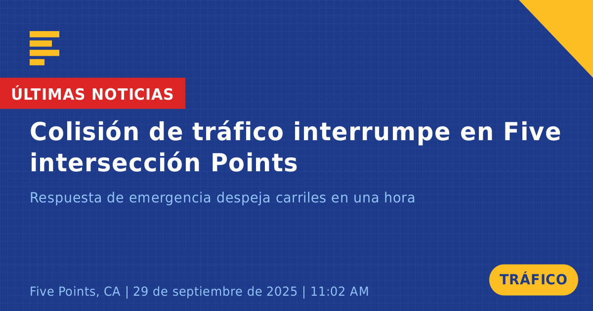 Un choque de tráfico ocurrió hoy en la intersección de W Jeffrey Avenue y Lassen Avenue en Five Points, CA, involucrando dos vehículos: un camión semi azul con un remolque azul y una camioneta Ford F150 azul. El incidente fue reportado aproximadamente a las 11:02 AM, causando interrupciones temporales en los carriles hacia el norte.