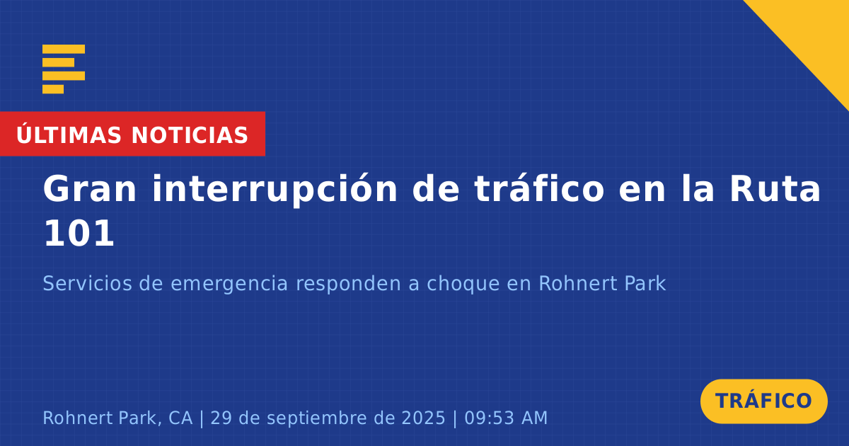 Una colisión de tráfico en la U.S. Highway 101 Sur en Rohnert Park, CA, ha causado importantes interrupciones en el tráfico hoy. El incidente ocurrió alrededor de las 9:54 AM e involucró dos vehículos: un vehículo azul y un camión de carga. El vehículo azul chocó tanto con el camión como con un divisor de concreto, quedando atascado contra el divisor y volviéndose inoperable.
