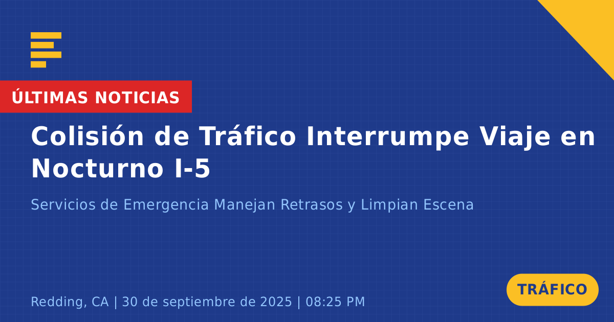 Un accidente de tráfico que involucró a dos vehículos ocurrió hoy en la Autopista 5 Norte (I-5 N) en Redding, CA, aproximadamente a las 8:25 PM. El incidente involucró a un Mustang modificado con daños en su parte frontal izquierda y un camión semi que estaba detenido en el arcén con sus luces de emergencia encendidas.