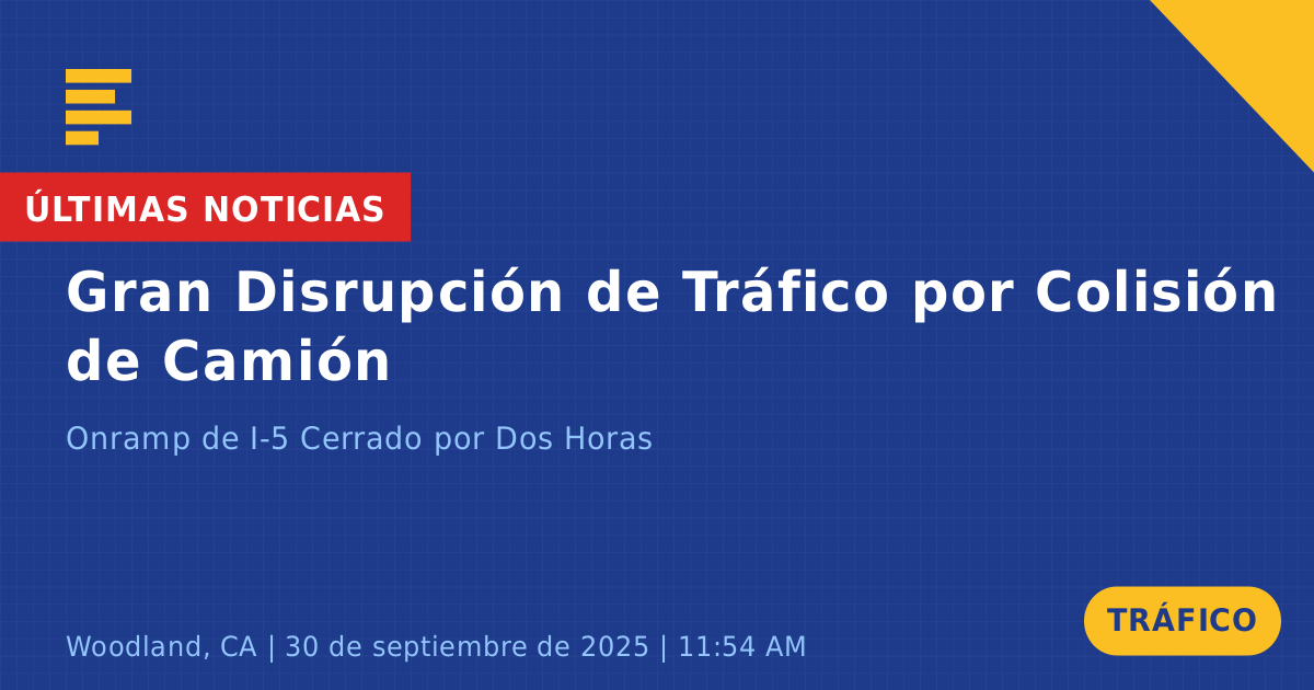 Un accidente de tráfico que involucró un camión Peterbuilt ocurrió hoy en la entrada a la autopista I-5 Sur en Woodland, CA. El incidente fue reportado alrededor de las 11:55 AM y causó importantes interrupciones en el tráfico en la zona.