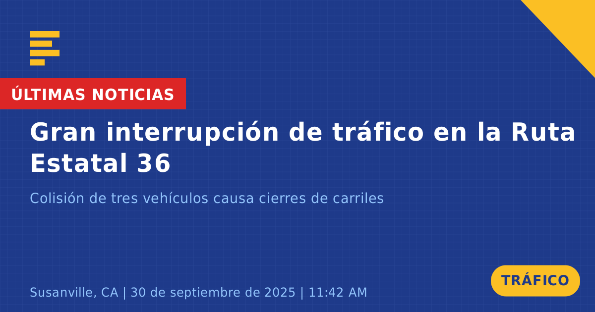 Un accidente de tráfico que involucró a tres vehículos ocurrió hoy en la Ruta Estatal 36 en Susanville, CA, lo que llevó a cierres temporales de carriles y significativas interrupciones en el tráfico. El incidente tuvo lugar alrededor de las 11:42 AM e involucró una furgoneta Ram, un sedán blanco y una camioneta blanca. Los informes indican que la camioneta blanca chocó con los otros dos vehículos, lo que provocó una rápida respuesta de emergencia.