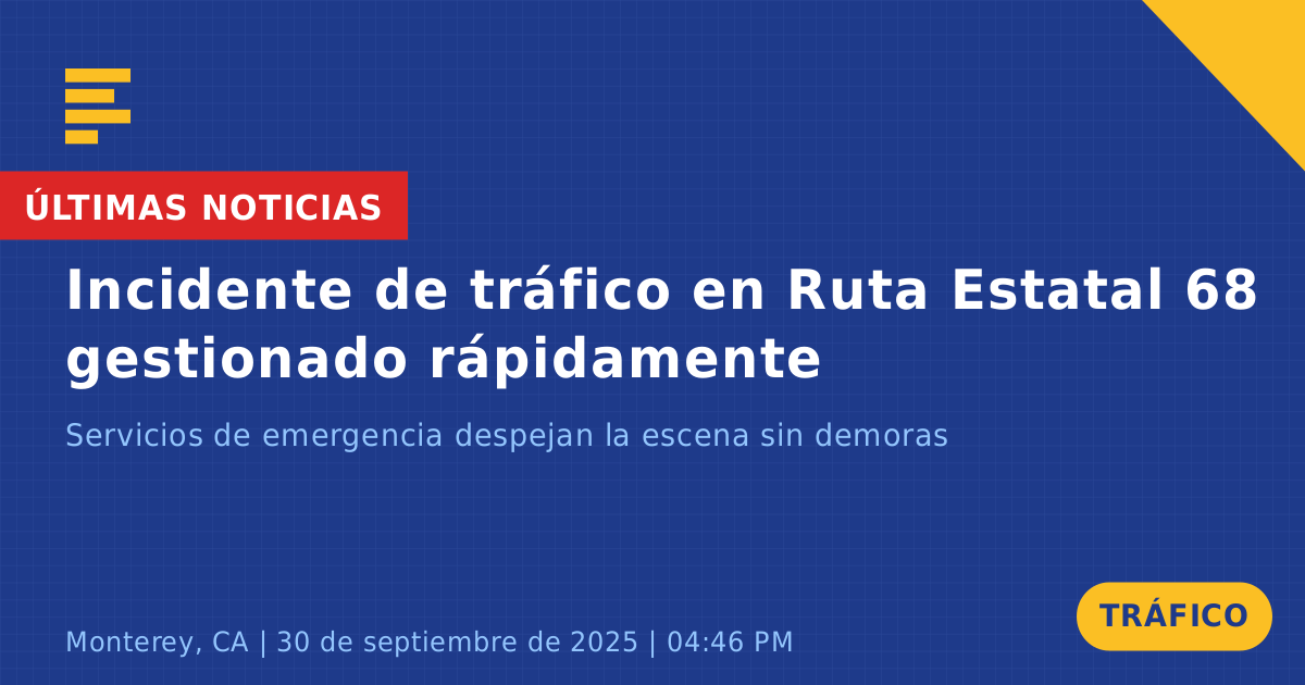 Un accidente de tráfico ocurrió hoy a las 4:47 PM en la Ruta Estatal 68 Este cerca de Laguna Seca en Monterey, CA. El incidente involucró a dos vehículos: una furgoneta azul y un Toyota Prius gris. Ambos vehículos fueron confirmados como manejables y estaban ubicados en el arcén derecho de la carretera.