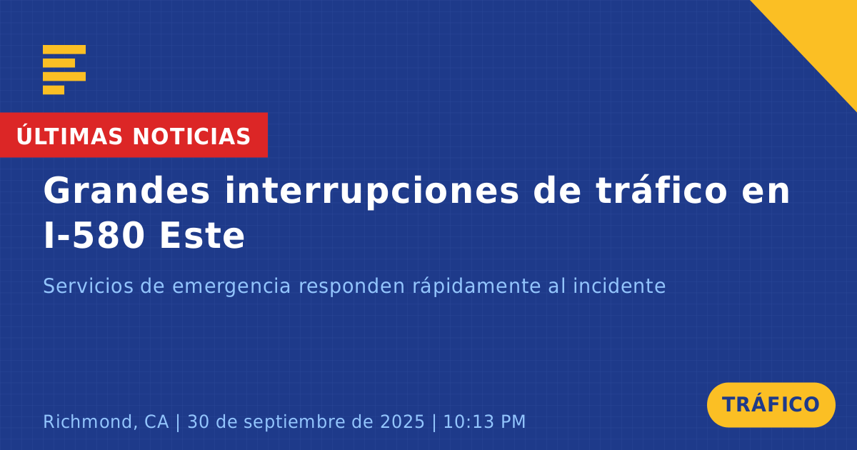Una colisión de tráfico en la Interestatal 580 Este en Richmond, CA, causó notables interrupciones en el tráfico hoy. El incidente involucró a dos vehículos: un Subaru Outback blanco y un Mercedes de cuatro puertas. La colisión fue reportada alrededor de las 10:14 PM, lo que provocó una rápida respuesta de los servicios de emergencia.