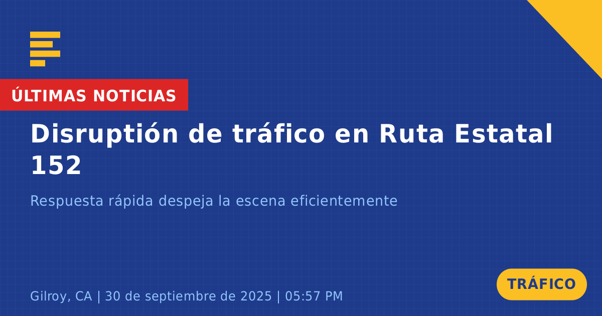 Un accidente de tráfico ocurrió hoy en la Ruta Estatal 152 Oeste, cerca del Área de Uso Diario Sprig en Gilroy, CA, afectando el flujo de tráfico en la zona. El incidente fue reportado aproximadamente a las 5:58 PM e involucró un vehículo que se deslizó fuera de la carretera y quedó atrapado en una barrera de tierra.