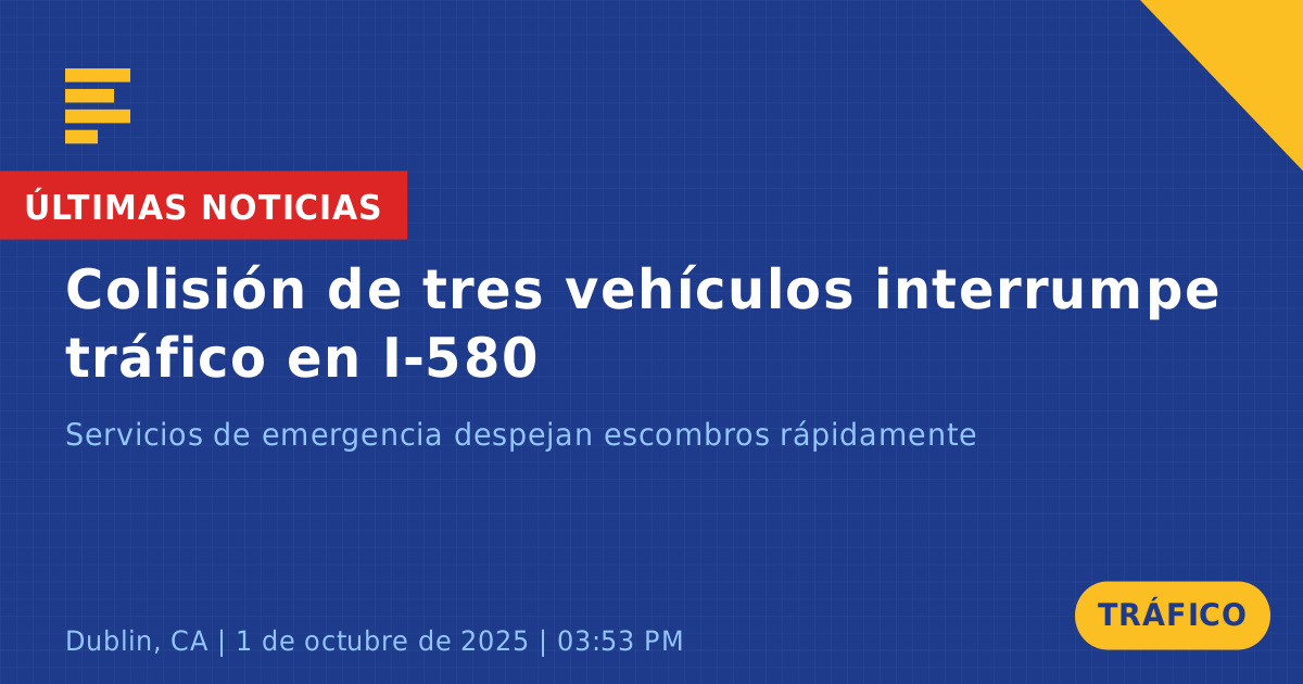 Un accidente de tráfico que involucró a tres vehículos ocurrió hoy en los carriles en dirección oeste de la Autopista 580 (I-580) cerca del intercambio con la Autopista 680 (I-680) en Dublin, CA. El incidente fue reportado aproximadamente a las 3:55 PM e involucró a un Toyota RAV4 blanco, un SUV Lexus blanco y un Toyota Matrix azul.