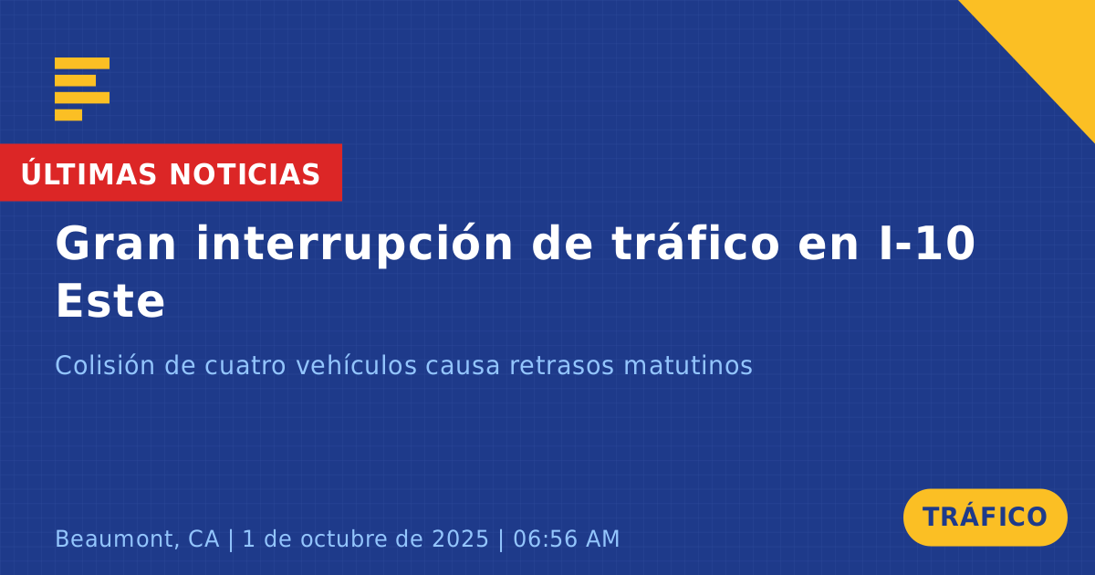 Un accidente de tráfico que involucró a cuatro vehículos ocurrió esta mañana en la Interestatal 10 Este en Beaumont, CA, causando importantes interrupciones en el tráfico. El incidente, que tuvo lugar alrededor de las 6:57 AM, involucró a una camioneta Ford F150 azul, un camión negro y otros dos vehículos.