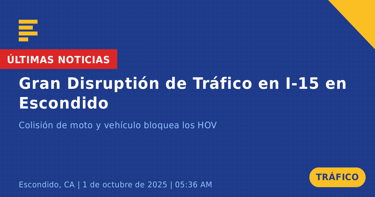 Un accidente de tráfico ocurrió hoy en la Interestatal 15 Sur cerca de la Avenida 9 en Escondido, CA, impactando significativamente el flujo de tráfico durante la hora pico de la mañana. El incidente involucró dos vehículos: una motocicleta y un vehículo desconocido. Ambos vehículos estaban bloqueando los carriles de Vehículos de Alta Ocupación (HOV).
