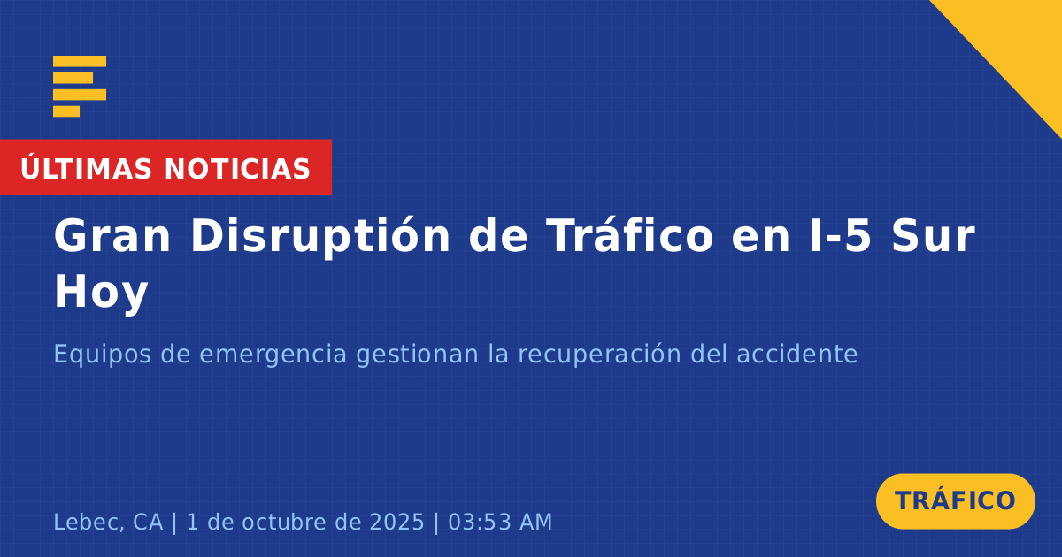 Un choque de tráfico que involucró a dos vehículos, una camioneta Ford F250 y un camión semi con un remolque de caja, ocurrió hoy en la Autopista 5 Sur (I-5 S) en Lebec, CA, aproximadamente a las 3:54 AM. El incidente ha provocado importantes interrupciones en el tráfico, con al menos un carril cerrado y la posibilidad de cierres adicionales mientras continúan las operaciones de recuperación.
