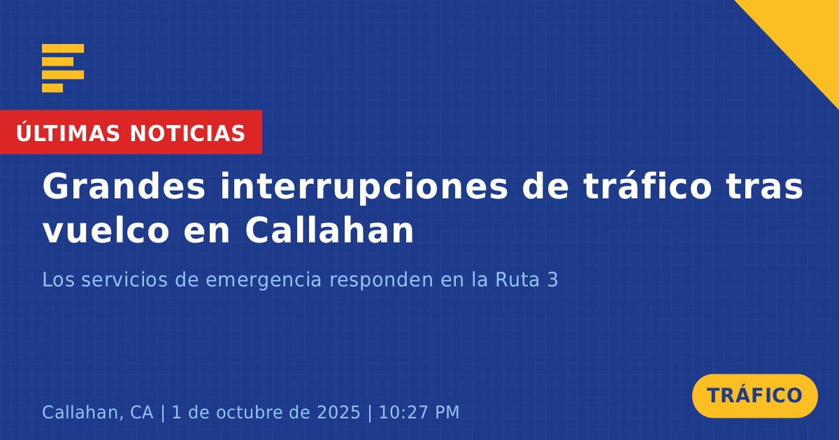 Una colisión de tráfico en la Ruta Estatal 3 Sur en Callahan, CA, ha provocado importantes interrupciones en el tráfico hoy. El incidente ocurrió alrededor de las 10:28 PM e involucró un solo vehículo, una Chevrolet Silverado, que volcó y terminó fuera de la carretera.