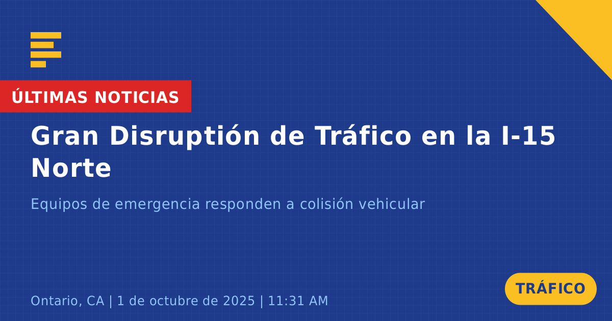 Una colisión de tráfico en la Interestatal 15 Norte en Ontario, CA, causó importantes interrupciones en el flujo de tráfico hoy. El incidente ocurrió cerca de la rampa de la 4th Street alrededor de las 11:30 AM, afectando el viaje matutino de muchos conductores. Se confirmaron dos vehículos en la escena: una camioneta blanca, que podría tener marcas relacionadas con el trabajo, y otro vehículo involucrado en la colisión.
