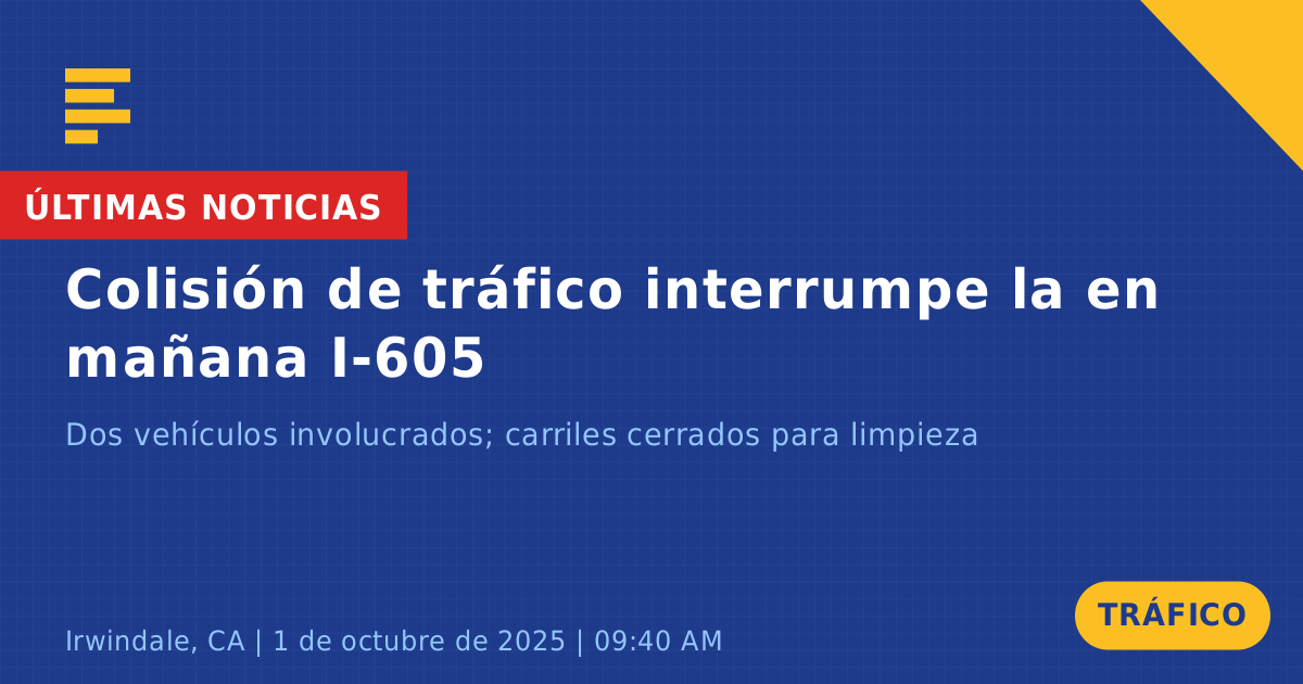 Una colisión de tráfico en la Interestatal 605 Sur en Irwindale, CA, ha causado importantes interrupciones durante la hora pico de la mañana hoy. El incidente, que involucró a dos vehículos: un camión de carga y una motocicleta, ocurrió alrededor de las 9:40 AM cerca de la salida de Ramona Boulevard.