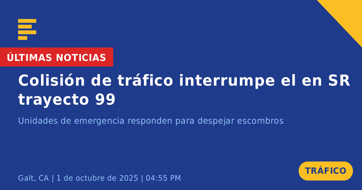 Una colisión de tráfico en la Ruta Estatal 99 Norte en Galt, CA, causó interrupciones significativas durante la hora pico de la tarde hoy. El incidente involucró un sedán gris que chocó contra un letrero al costado de la carretera, lo que resultó en escombros esparcidos por la vía. Las unidades de emergencia fueron rápidamente despachadas para gestionar la escena y garantizar la seguridad de los conductores que pasaban.