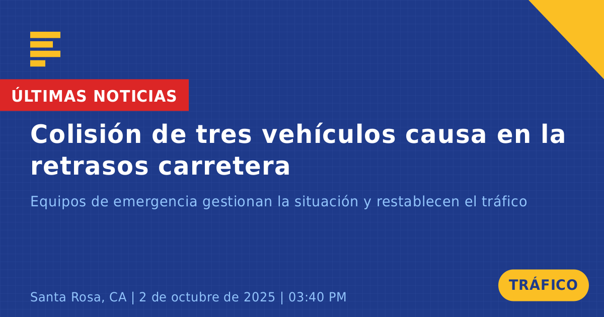 Un accidente de tráfico que involucró a tres vehículos ocurrió hoy en la autopista US 101 Norte cerca de la salida de Baker Avenue en Santa Rosa, CA. El incidente tuvo lugar alrededor de las 3:41 PM e involucró a una camioneta blanca con remolque, una Nissan Rogue blanca y una camioneta Chevrolet blanca. Se reportó que un vehículo se movió aproximadamente cinco pies hacia una zanja, mientras que otro impactó un árbol.