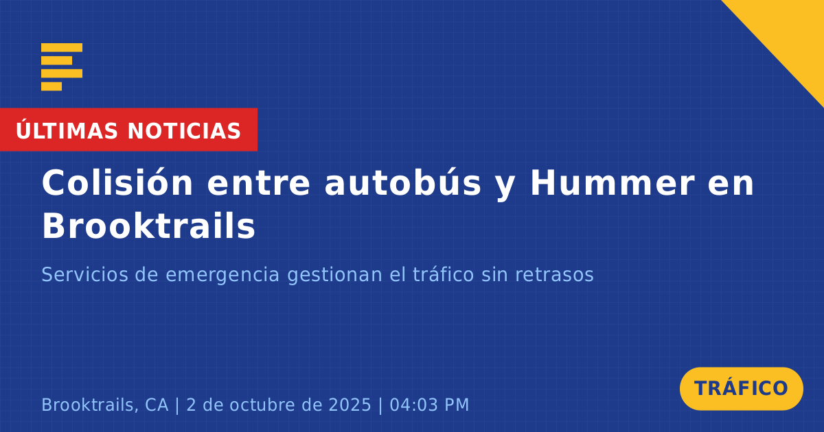 Un accidente de tráfico que involucra dos vehículos, un autobús de campamento y un Hummer, ocurrió hoy en Brooktrails, CA, aproximadamente a las 4:03 PM. El incidente tuvo lugar en la carretera cerca del marcador 2550 Mm20 E Men 25.50. Afortunadamente, la carretera permaneció abierta durante el incidente, lo que resultó en un impacto mínimo en el tráfico y sin retrasos significativos para los conductores.