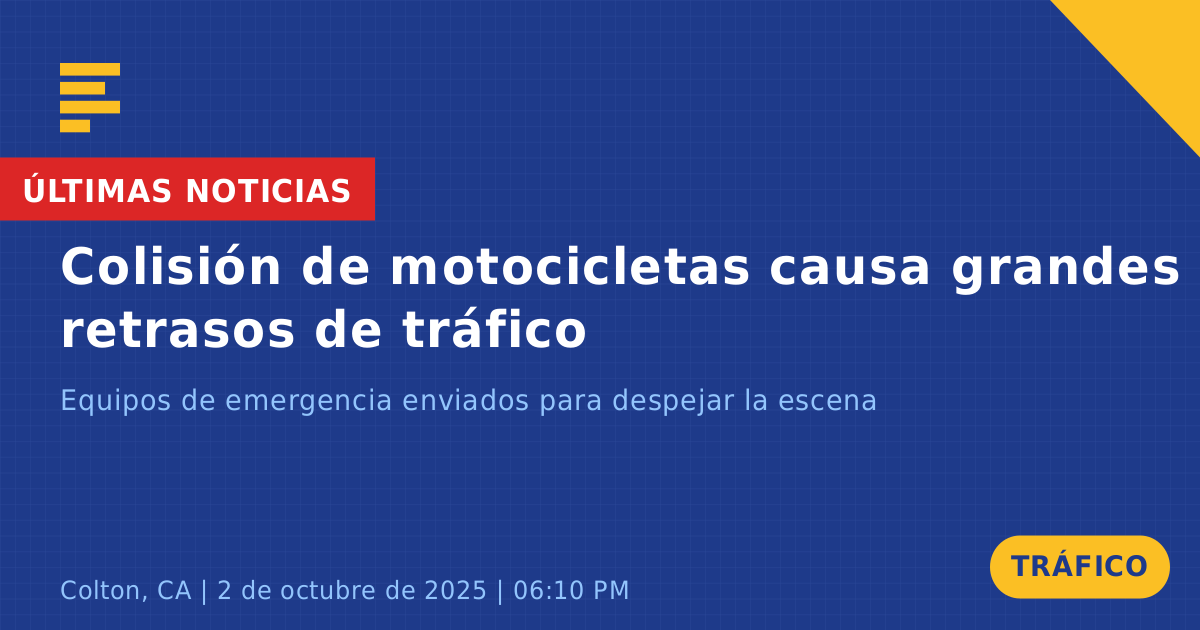 Un accidente de tráfico que involucró a dos motocicletas ocurrió hoy en la Interestatal 215 Sur cerca de la Calle Washington en Colton, CA, lo que provocó importantes interrupciones en el tráfico. El incidente tuvo lugar alrededor de las 6:11 PM, con una motocicleta descrita como verde/verde y la otra como verde/azul. Ambos vehículos estaban ubicados en el carril 1, causando retrasos para los conductores en la zona.