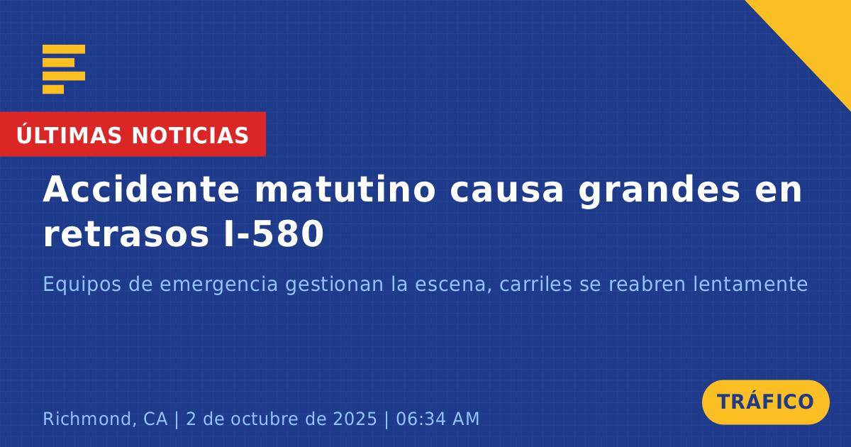 Una colisión de tráfico en la Interestatal 580 Oeste en Richmond, CA, causó importantes interrupciones en el tráfico durante la mañana de hoy. El incidente, que involucró a tres vehículos: un SUV negro, un sedán gris y un vehículo de color desconocido, ocurrió alrededor de las 6:36 AM. Los informes iniciales indicaron que el SUV negro y el sedán gris estaban orientados hacia el oeste, mientras que el tercer vehículo se encontraba en el carril lento con las luces de emergencia encendidas.