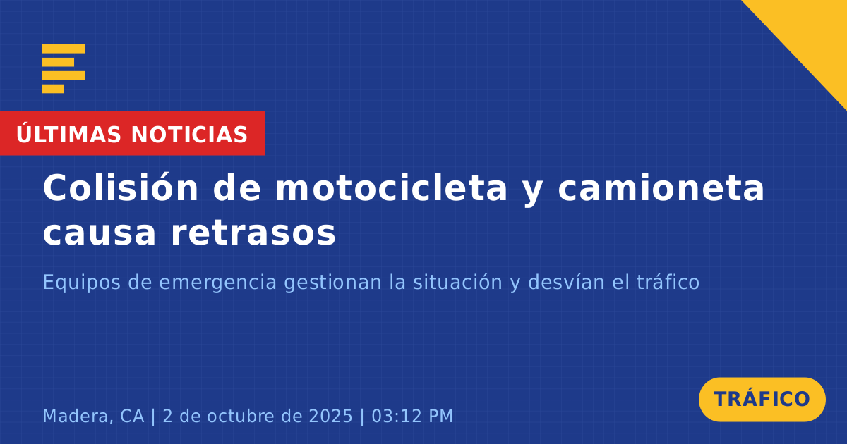 Un accidente de tráfico que involucró a una motocicleta y una camioneta gris ocurrió hoy en la intersección de Road 36 y Avenue 16 en Madera, CA. El incidente fue reportado alrededor de las 3:13 PM y provocó importantes interrupciones en el tráfico en la zona. Los servicios de emergencia fueron despachados rápidamente para gestionar la escena y garantizar la seguridad.