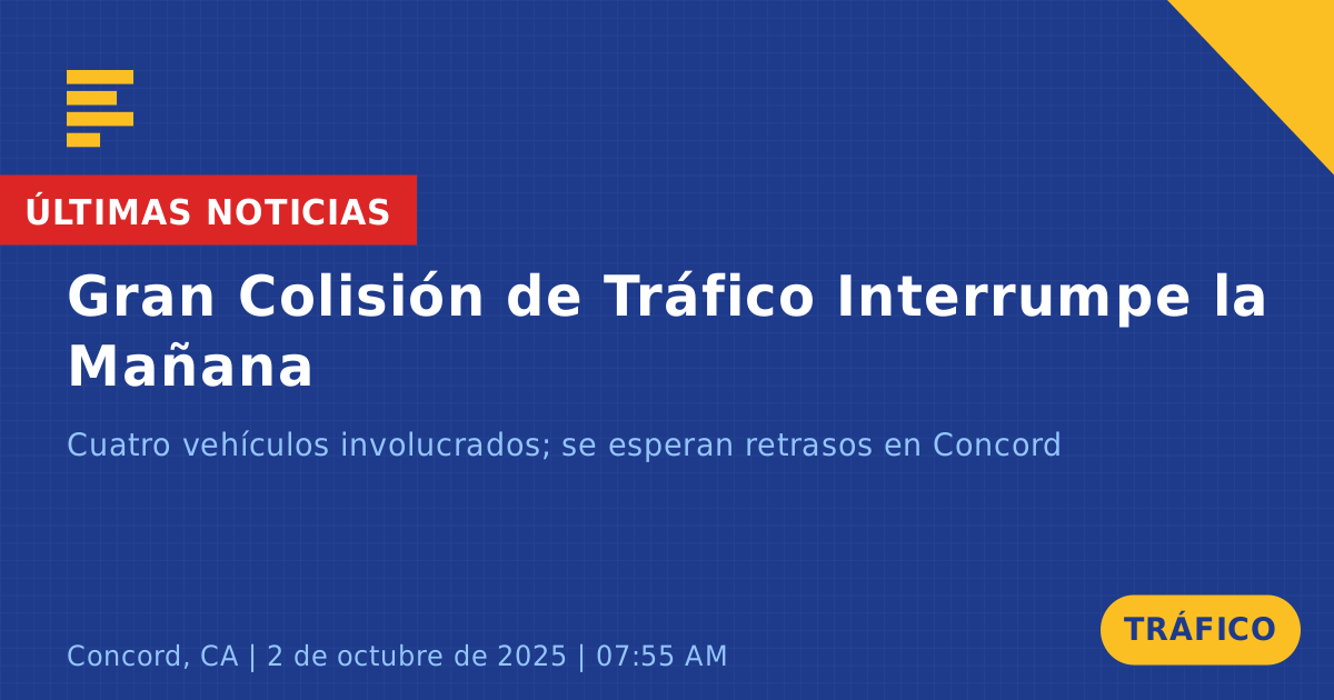 Un accidente de tráfico que involucró a cuatro vehículos ocurrió hoy en la intersección de la Ruta Estatal 242 Norte y la salida de Grant Street en Concord, CA. El incidente tuvo lugar durante la hora pico de la mañana, lo que provocó importantes interrupciones en el tráfico en la zona. Las unidades de respuesta de emergencia llegaron rápidamente para gestionar la escena e implementar medidas de control de carriles para garantizar la seguridad de todos los conductores.