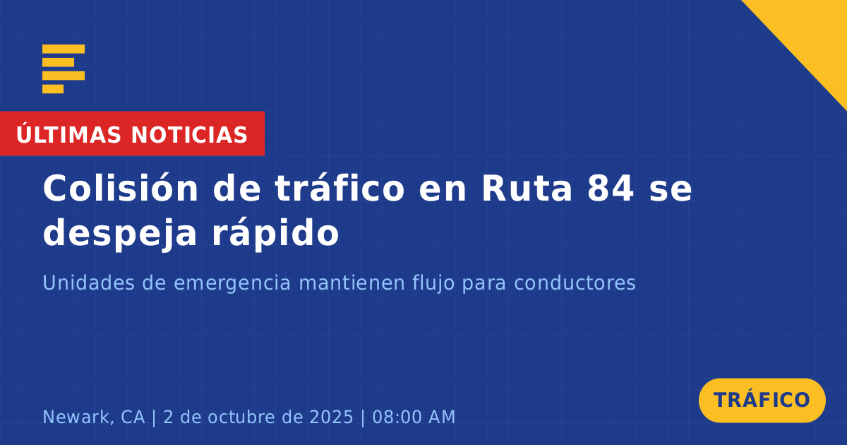 Un accidente de tráfico ocurrió esta mañana en la Ruta Estatal 84 Este, en la rampa de Newark Boulevard, en Newark, CA. Aproximadamente a las 8:01 AM, un solo vehículo negro, inicialmente descrito como un Toyota Camry y luego identificado como un Honda, chocó contra un árbol en el lado derecho de la carretera. El vehículo sufrió daños moderados y tenía las luces de emergencia activadas.