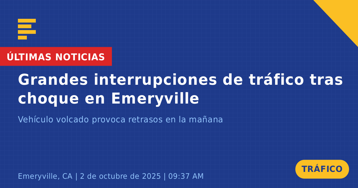 Una colisión de tráfico en la carretera Frontage, cerca de la Ruta Estatal 13 y la Interestatal 80 Oeste en Emeryville, CA, ha causado importantes interrupciones en el tráfico hoy. El incidente ocurrió durante la hora pico de la mañana alrededor de las 9:38 AM, cuando un vehículo se volcó y quedó sobre su techo. Los servicios de emergencia respondieron rápidamente, enviando múltiples unidades para gestionar el tráfico y controlar la escena.