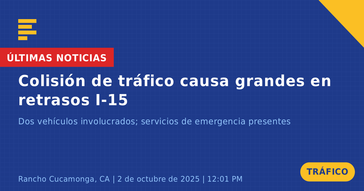 Una colisión de tráfico en la Interestatal 15 Sur cerca de Foothill Boulevard en Rancho Cucamonga, CA, causó importantes interrupciones en el tráfico hoy alrededor del mediodía. El incidente involucró a dos vehículos: un SUV Honda azul y un vehículo no identificado. La colisión fue provocada por un reventón de neumático, lo que resultó en que el SUV Honda se moviera al lado derecho de la carretera.