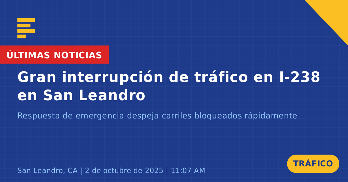 Una colisión de tráfico en la Interestatal 238 Norte en la intersección con la Interestatal 880 Norte en San Leandro, CA, causó importantes interrupciones en el tráfico hoy. El incidente, que involucró un SUV Toyota gris, fue reportado aproximadamente a las 11:11 AM. El vehículo estaba bloqueando varios carriles, lo que llevó a la congestión durante la ajetreada hora de la mañana.