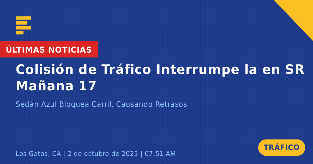 Una colisión de tráfico en la Ruta Estatal 17 Norte en Los Gatos, CA, causó importantes interrupciones en el tráfico durante la hora pico de la mañana hoy. El incidente involucró un sedán azul que aparentemente derrapó y sufrió daños moderados en la parte delantera. Este vehículo bloqueaba el carril 1, lo que llevó a un aumento de la congestión y retrasos para los conductores en la zona.