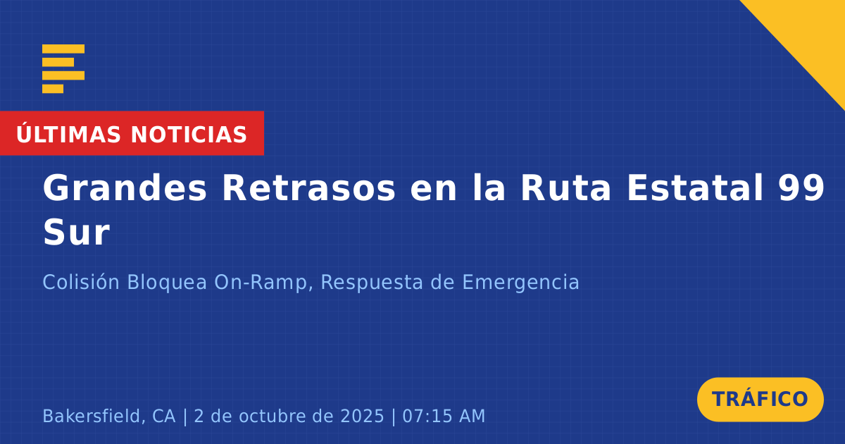 Una colisión de tráfico en la Ruta Estatal 99 Sur en Olive Drive, en Bakersfield, CA, ha causado importantes interrupciones en el tráfico esta mañana. El incidente ocurrió alrededor de las 7:15 AM e involucró un vehículo que está bloqueando la entrada a la Ruta Estatal 99 Sur. Los servicios de emergencia han desplegado múltiples unidades en la escena para gestionar el tráfico y garantizar la seguridad.