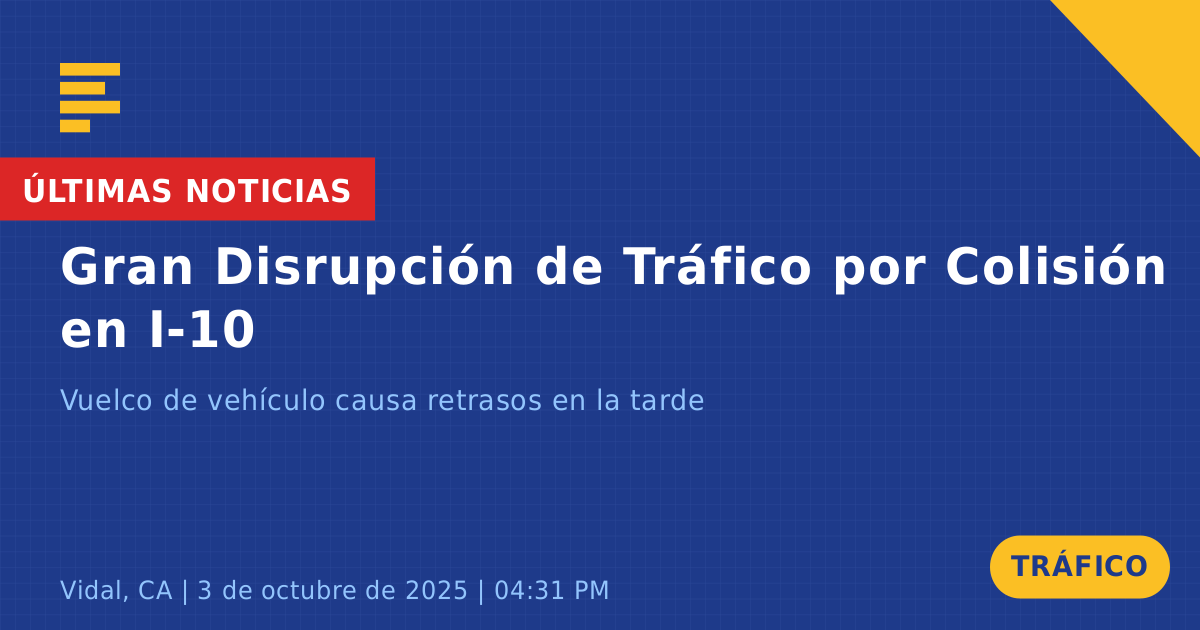 Un accidente de tráfico que involucró un solo vehículo ocurrió hoy en la Interestatal 10 Sur en Vidal, CA, provocando importantes interrupciones en el tráfico. El incidente, que involucró a una camioneta Toyota blanca que volcó, fue reportado alrededor de las 4:32 PM. Informes iniciales sugirieron la participación de un camión de carga, pero se ha confirmado que solo la Toyota estaba en la escena.