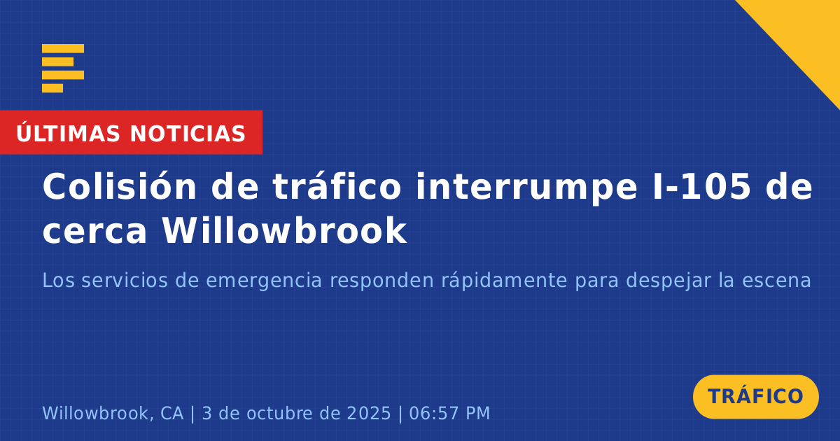 Un accidente de tráfico ocurrió hoy en la Interestatal 105 Oeste cerca de Wilmington Avenue en Willowbrook, CA, involucrando dos vehículos: una motocicleta y una bicicleta. El incidente fue reportado aproximadamente a las 6:58 PM, lo que provocó interrupciones inmediatas en el tráfico, ya que todos los carriles fueron detenidos inicialmente. Los servicios de emergencia respondieron rápidamente para gestionar la escena y desviar el tráfico para minimizar los retrasos.
