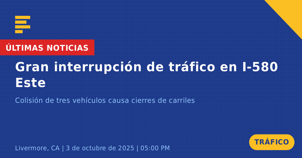 Un accidente de tráfico ocurrió hoy en la Interestatal 580 Este cerca de Vasco Road en Livermore, CA, afectando significativamente el flujo de tráfico durante la hora pico de la tarde. El incidente involucró a tres vehículos: un vehículo de cuatro puertas y un SUV gris, con un vehículo considerado no manejable, mientras que los otros dos permanecieron operativos.
