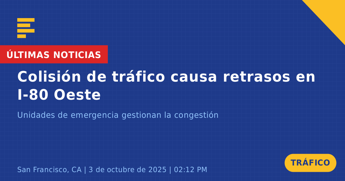 Un accidente de tráfico que involucró a dos vehículos ocurrió hoy en la Interestatal 80 Oeste, cerca de la entrada de Treasure Island en San Francisco, CA. El incidente tuvo lugar alrededor de las 2:12 PM e involucró a un Honda azul y un Honda blanco. Tras la colisión, el carril 3 quedó bloqueado, lo que resultó en congestión de tráfico para los automovilistas en la zona.