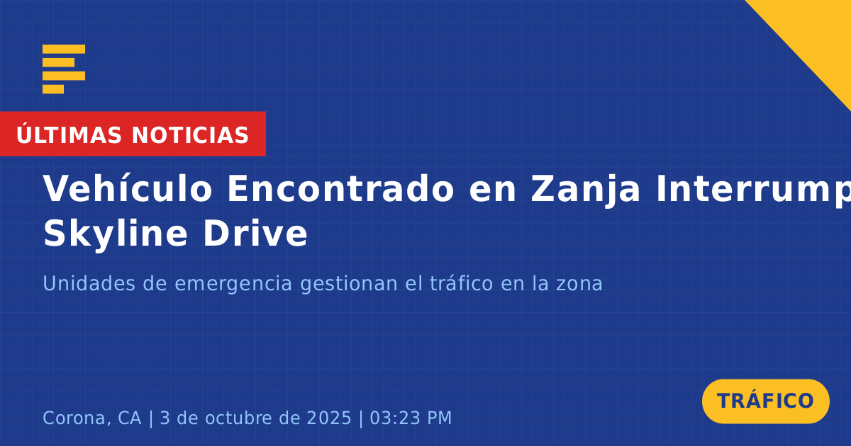 Un accidente de tráfico ocurrió hoy en Skyline Drive en Corona, CA, involucrando un vehículo que fue encontrado fuera de la carretera en una zanja. El incidente fue reportado alrededor de las 3:25 PM cuando excursionistas observaron el vehículo dañado, que tenía la puerta del conductor rota o abierta y parecía estar en mal estado.