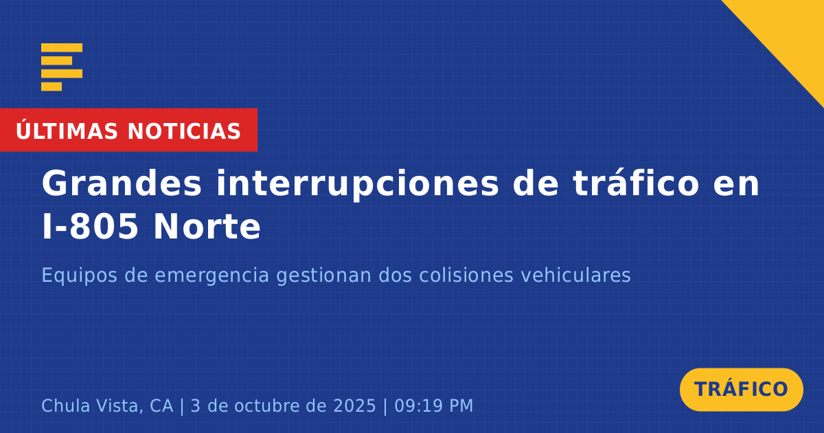 Una colisión de tráfico en la Interestatal 805 Norte en Chula Vista, CA, causó importantes interrupciones en el tráfico hoy. El incidente involucró a dos vehículos, cada uno en colisiones individuales, y ocurrió alrededor de las 9:21 PM. Equipos de respuesta de emergencia llegaron rápidamente al lugar para gestionar la situación y establecer zonas de control para la seguridad.