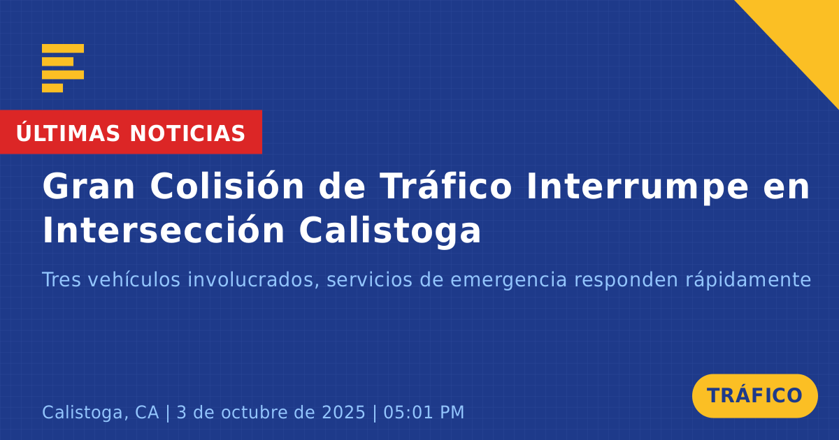 Un accidente de tráfico ocurrió hoy en la intersección de la Ruta Estatal 29 y Old Lawley Toll Road en Calistoga, CA, involucrando tres vehículos: un Tesla gris, una camioneta Dodge blanca y un vehículo desconocido que se salió de la carretera. El incidente fue reportado alrededor de las 5:02 PM, lo que provocó importantes interrupciones en el tráfico en la zona.