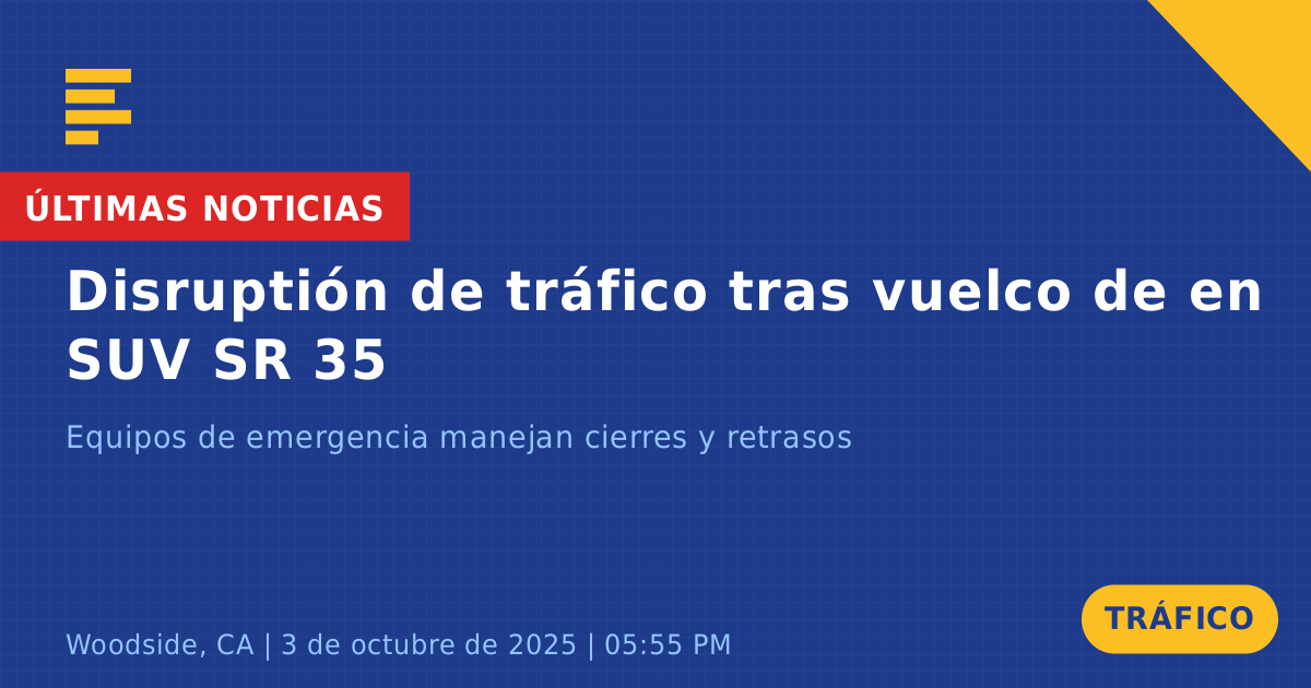 Una colisión de tráfico en la Ruta Estatal 35 (SR 35) en Woodside, CA, ha causado importantes interrupciones en el flujo de tráfico hoy. El incidente ocurrió aproximadamente a las 5:58 PM cuando un SUV gris volcó sobre su techo tras perder un giro y chocar contra la pared lateral de una colina.