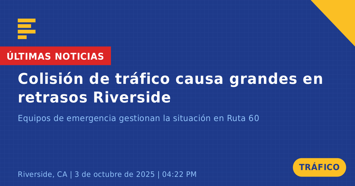 Una colisión de tráfico en la Ruta Estatal 60 Oeste, en la intersección de la Calle Orange en Riverside, CA, causó importantes interrupciones en el tráfico hoy. El incidente ocurrió alrededor de las 4:23 PM e involucró a dos vehículos: un Chevrolet Equinox gris y un Toyota blanco.